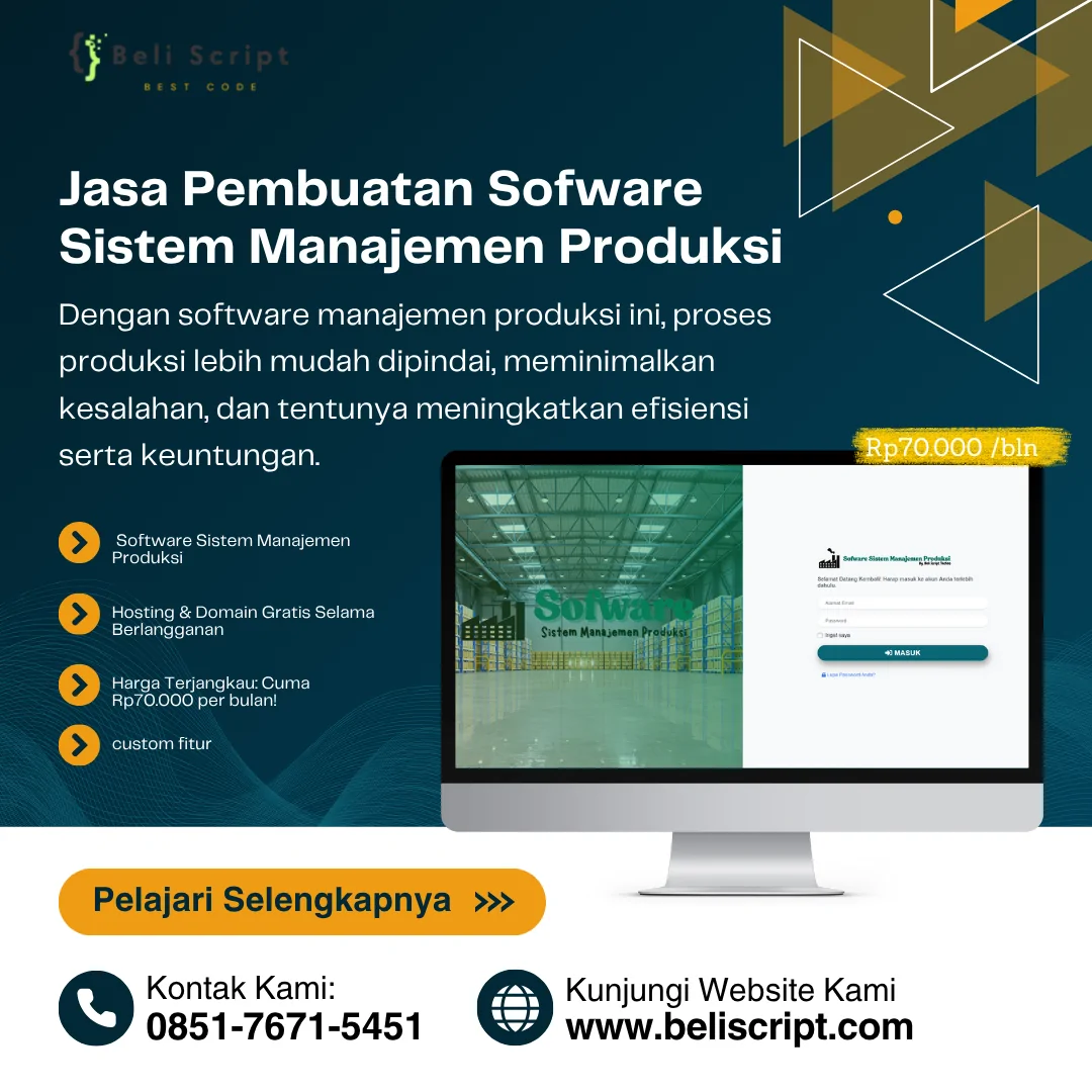 Kami menghadirkan Software Sistem Manajemen Produksi All-in-One yang didesain khusus untuk meningkatkan efisiensi dan mengoptimalkan operasional perusahaan produksi Anda. Dengan solusi digital terintegrasi ini, kelola seluruh aspek produksi Anda mulai dari bahan baku hingga produk jadi dengan lebih mudah dan akurat. Dapatkan semua keunggulan ini hanya dengan Rp70.000 per bulan, sudah termasuk free hosting dan domain selama masa berlangganan.