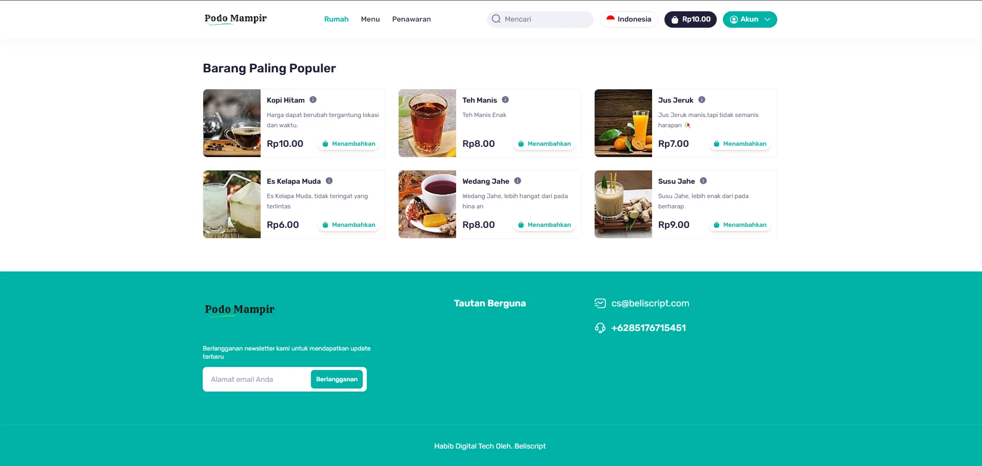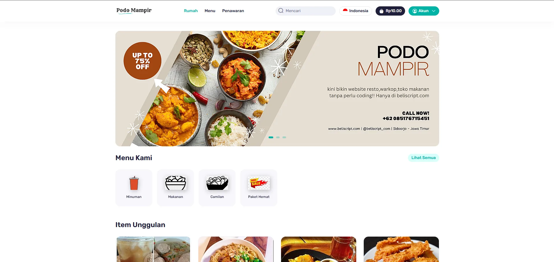 Kesimpulan: Membangun dan mengelola restoran yang efektif dan modern adalah kunci untuk kesuksesan jangka panjang. Dengan memanfaatkan "Podo Mampir Restoran" yang mengintegrasikan aplikasi web progresif (PWA) dan sistem POS, Anda dapat meningkatkan efisiensi operasional dan kepuasan pelanggan. Panel admin yang kuat dan responsif memudahkan pengelolaan, sedangkan fitur-fitur seperti reservasi meja, pengiriman, dan pengambilan pesanan memastikan kenyamanan pelanggan. Pengaturan bisnis yang mudah, dukungan multi bahasa, serta integrasi dengan berbagai alat komunikasi dan pembayaran menjadikan "Podo Mampir Restoran" solusi yang komprehensif dan andal.