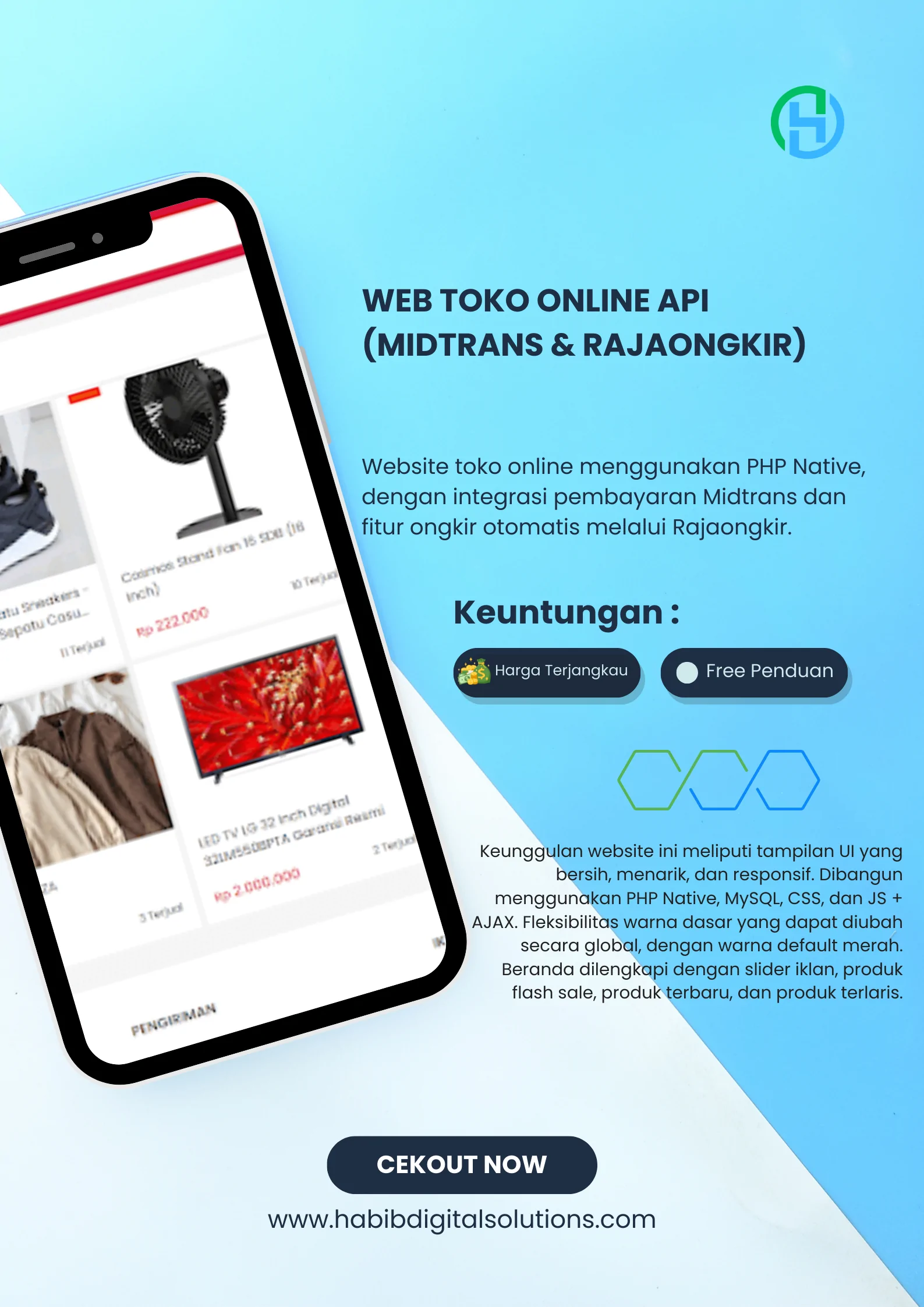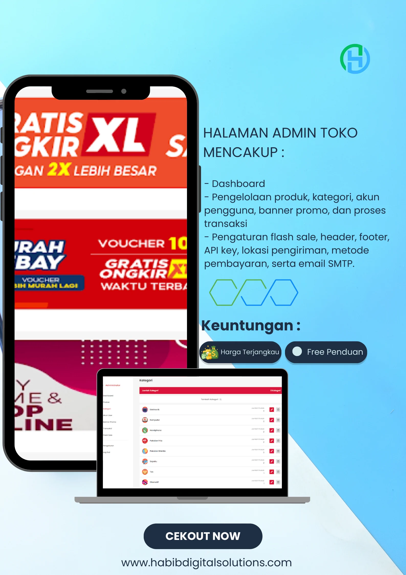 Pengaturan Fleksibel: Kontrol penuh terhadap pengaturan Flash Sale, header, footer, API key, lokasi pengiriman, metode pembayaran, hingga pengaturan email SMTP Anda.